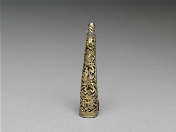 弓形,銅鍍金質,由基部往指尖漸細,整器為鏤空萬字紋錦地,外飾菱形紋,正面有萬壽無疆四字,字樣由指尖依序往基部漸大,底部為兩側交疊,大小可調整。此器與故雜3640為一對。