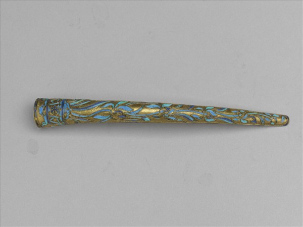 弓形,銅鍍金質,正面為點翠盆蘭,花盆中有整珠蘭花;背部鏤空古錢紋;底部為兩側交疊而成,使套圍可調整。此器與故雜3642為一對。