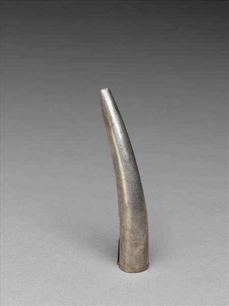 銀質弓形指甲套,正面光素無紋,背部為鏤空竹節,底部為兩側交疊而成,可調整。此器與故雜3648為一對。