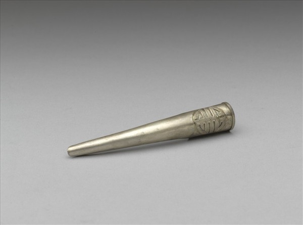 銀質弓形指甲套,基底飾一團壽字,鑄造而成,壽字上鏨刻魚子紋;背部與底部皆為面延伸出之銀片彎折而成,大小可調整;套部另有戳記二,一為「足文」,另一無法辨識。此器與故雜3651為一對。