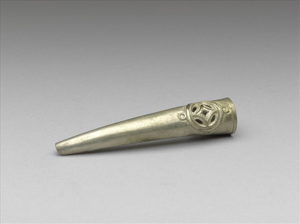 銀質弓形,由底往指尖漸細,正面底部飾一鏤空古錢紋,輪廓皆以繩紋為飾;外圈繩紋外四角再有圓形繩紋,正面銀片延伸凹折為背,底部一體成型,套圍固定。此器與故雜3655為一對。