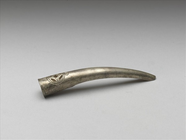 銀質弓形,底面以陰線刻描繪鏤空古錢紋一,錢紋四角處另飾雙圈紋;背作橫格式,底部為兩側交疊而成,套圍可調整。此器與故雜3657為一對。