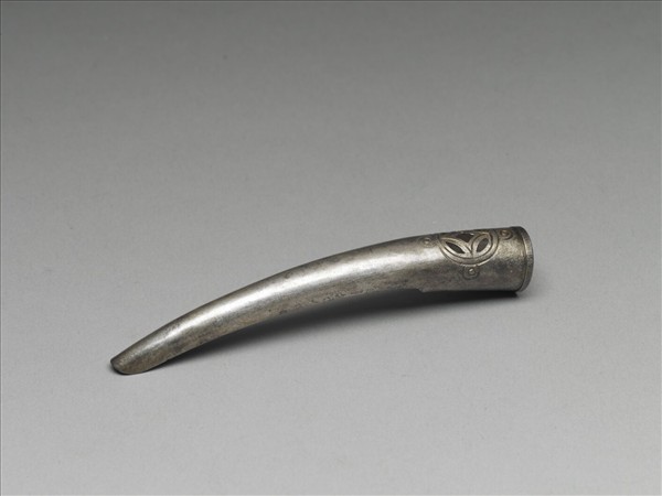 銀質弓形,由基底往指尖漸細,面底部飾古錢紋一,錢紋之四方位處另飾同心圓各一,紋飾以陰線刻技法表現;背部作空格式,以利通風,套部為兩股交疊而成,套圍大小可調整。此器與故雜3659為一對。