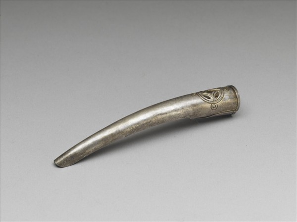 銀質弓形,由基底往指尖漸細,面底部飾古錢紋一,錢紋之四方位處另飾同心圓各一,紋飾以陰線刻技法表現;背部作空格式,以利通風,套部為兩股交疊而成,套圍大小可調整。此器與故雜3661為一對。
