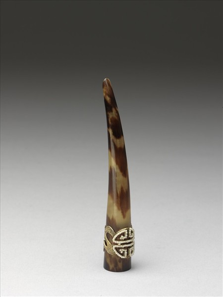 弓形,以玳瑁雕成,由基部往指尖漸細,基部面飾有緝米珠團壽紋,壽字兩旁延伸綬帶紋至背部,套背部分飾鏤空相扣古錢紋共七,指尖背部有開口,以利通風,套圍固定。此器與故雜3663為一對。
