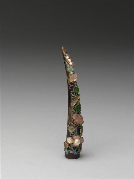 弓形,以玳瑁雕成,面部飾連枝四瓣花卉與葉,花卉部分鑲嵌有粉紅色碧璽與珍珠,葉則嵌有翡翠,枝以點翠裝飾;背部鏤雕相扣古錢紋與一半圓形開口,指尖未封閉;套部上一環形金圈,與面部紋飾相接。此器與故雜3669為一對。