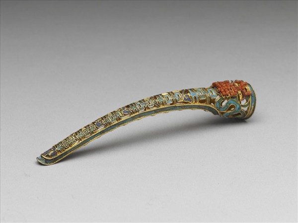 弓形,銅質,面部飾連續鏤空雙喜字紋,唯基底囍字緝珊瑚米珠,其餘為點翠,囍字間另間有點翠朵雲紋;背作空格式,套部為兩股交疊而成,大小可調整。此器與故雜3672為一對。