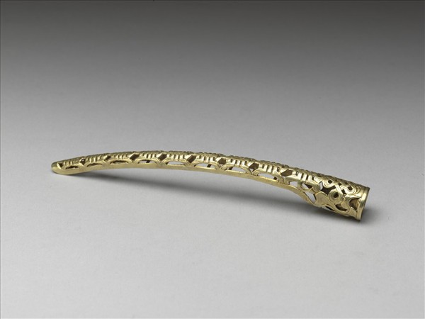 弓形,銀質鍍金,面部飾連續鏤空長壽字,基底飾鏤空盤長一,盤長兩側延伸綬帶,面部紋飾上皆鏨刻魚子紋;背作空格式,套部為兩股交疊而成,大小可調整。此器與故雜3675為一對。