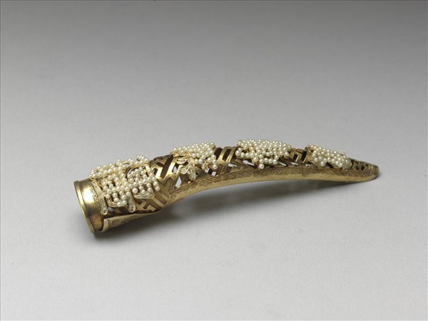 弓形,鍍金,自基部至指尖漸細,整器作鏤空萬字不斷紋錦地,面部以米珠組「萬壽無疆」四字,字樣由指尖往基底依序漸大;指尖背部有開口,套部基背包合而成,上有「寶華」與「足銀」戳記二方。此器與故雜3676為一對。