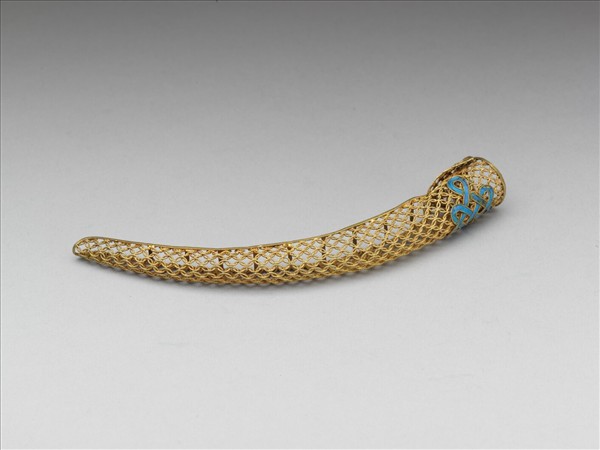 弓形,鍍金,自基至指尖漸細,面部作鏤空古錢紋錦地,基底飾一點翠盤長紋;背部作鏤空多格式,套部為面部延伸之兩股交疊而成,套圍可調整。此器與故雜3704為一對。