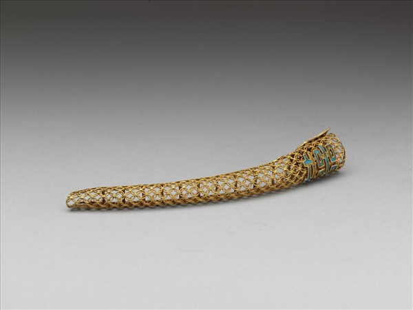 弓形,銅質鍍金,自基至指尖漸細,面部作鏤空古錢紋錦地,基底飾一點翠雙喜紋;背部作鏤空多格式,套部為面部延伸之兩股交疊而成,套圍可調整。此器與故雜3707為一對。