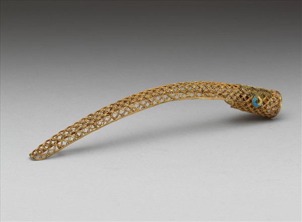 弓形,銅質鍍金,自基至指尖漸細,面部作鏤空古錢紋錦地,基底飾一點翠盤長紋;背部作鏤空多格式,套部為面部延伸之兩股交疊而成,套圍可調整。此器與故雜3709為一對。