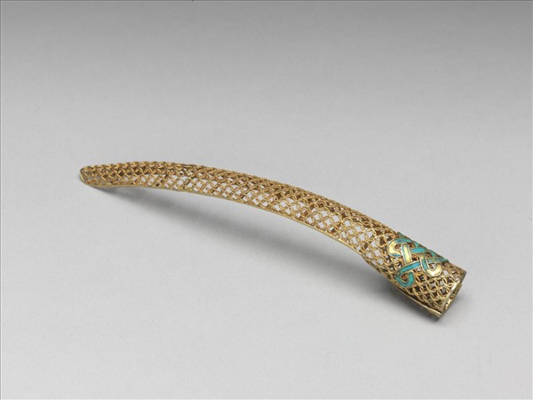 弓形,銅質鍍金,自基至指尖漸細,面部作鏤空古錢紋錦地,基底飾一點翠盤長紋;背部作鏤空多格式,套部為面部延伸之兩股交疊而成,套圍可調整。此器與故雜3710為一對。