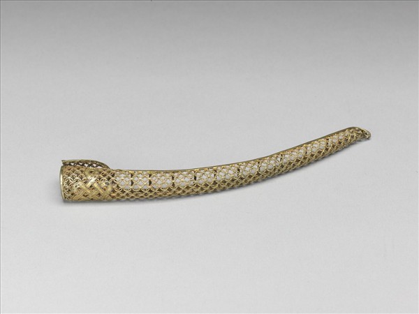 弓形,銅質鍍金,自基至指尖漸細,面部作鏤空古錢紋錦地,基底飾盤長紋;背部作鏤空多格式,套部為面部延伸之兩股交疊而成,套圍可調整。此器與故雜3713為一對。