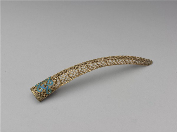 弓形,銅質鍍金,自基至指尖漸細,面部作鏤空古錢紋錦地,基底飾一點翠盤長紋;背部作鏤空多格式,套部為面部延伸之兩股交疊而成,套圍可調整。此器與故雜3721為一對。