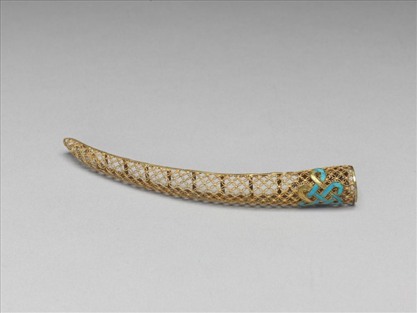 弓形,銅質鍍金,自基至指尖漸細,面部作鏤空古錢紋錦地,基底飾一點翠盤長紋;背部作鏤空多格式,套部為面部延伸之兩股交疊而成,套圍可調整。此器與故雜3724為一對。