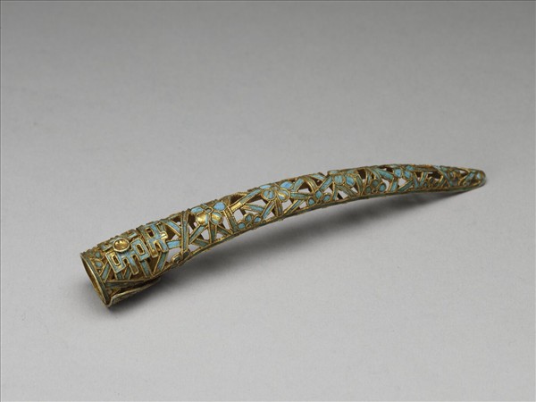 弓形,銀質鍍金,自基至指尖漸細,面部滿飾鏤空梅花紋與冰片紋,基底飾一雙喜字,紋飾皆點翠;背部作鏤空多格式,套部為面部延伸之兩股交疊而成,套圍可調整。此器與故雜3726為一對。