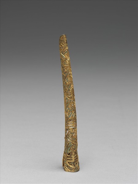 弓形,鍍金,自基至指尖漸細,面部作鏤空萬字不斷紋錦地,由指尖往基底另飾五個漸大團壽字,整器紋飾有萬壽之寓意;背部作鏤空多格式,套部為面部延伸之兩股交疊而成,套圍可調整。此器與故雜3729為一對。
