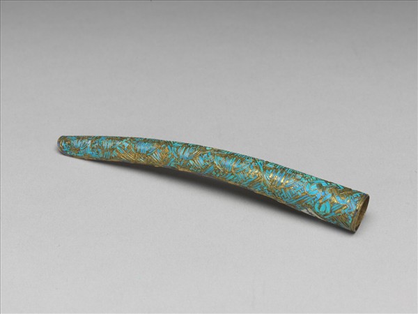 弓形,銅質鍍金,整器點翠,自基至指尖漸細,面部作萬字不斷紋錦地,基底飾盤長紋一,往指尖部分均飾六個團壽紋,字樣漸小;背部作鏤空多格式,套部為面部延伸之兩股交疊而成,套圍可調整。此器與故雜3731為一對。
