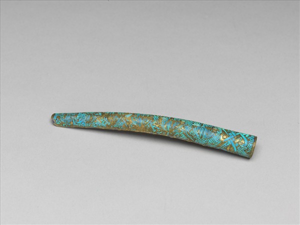 弓形,銅質鍍金,整器點翠,自基至指尖漸細,面部作萬字不斷紋錦地,基底飾盤長紋一,往指尖部分均飾六個團壽紋,字樣漸小;背部作鏤空多格式,套部為面部延伸之兩股交疊而成,套圍可調整。此器與故雜3730為一對。
