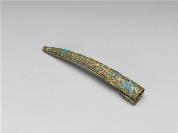 弓形,銅質鍍金,自基至指尖漸細,整器作萬字不斷紋錦地,面部間飾點翠團壽紋與如意各三,如意上綁有綬帶,紋飾往基底漸大,器緣另飾以兩道繩紋,繩紋間亦覆點翠;套部為面部延伸之兩股交疊而成,套圍可調整。此器與故雜3732為一對。