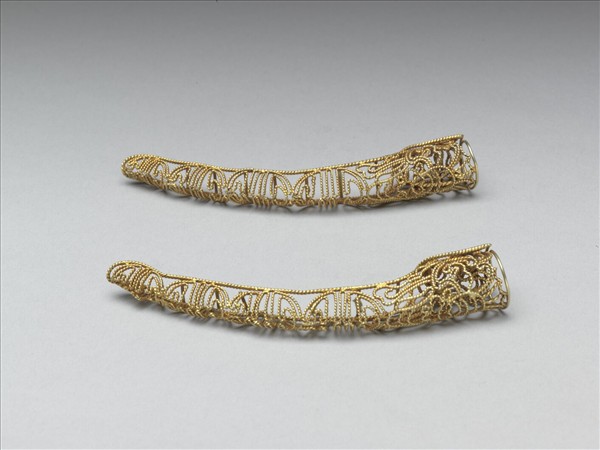 弓形,銅質鍍金,整器紋飾以纍絲技法表現,套面連飾四個團壽紋,字樣往基部漸大,基底飾蝠紋一,蝠身四周延伸綬帶;背作鏤空多格式,套部為面部延伸之兩股交疊而成,套圍可調整。此器與故雜3795為一對。