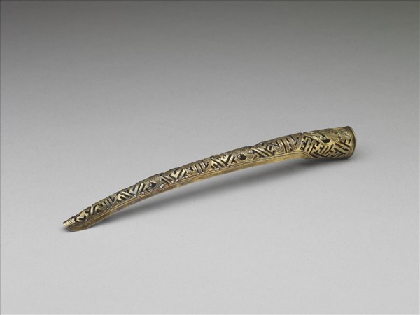 弓形,從基部到指尖漸漸變細,團壽和蝠交替裝飾,中間以卍字紋間隔,紋飾從指尖逐漸變小,基及背部均包合。此器與故雜3797為一對。