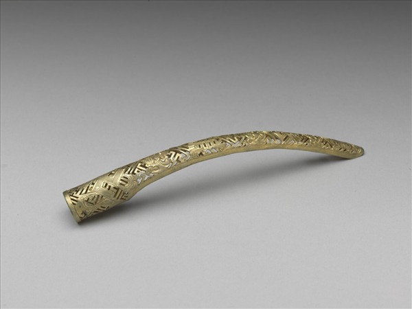 弓形,從基部到指尖漸漸變細,基部卍字紋上飾兩排連珠紋,壽字和蝠交替裝飾,中間以卍字紋間隔,紋飾從指尖逐漸變小,背部作空格式。此器與故雜3799為一對。