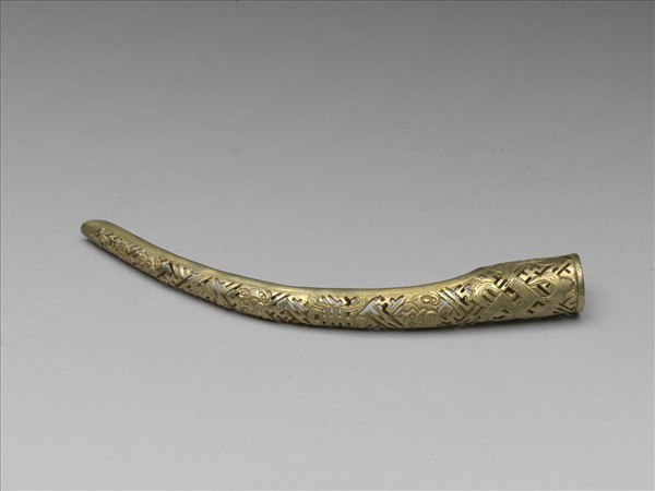 弓形,從基部到指尖漸漸變細,基部卍字紋上飾兩排連珠紋,壽字和蝠交替裝飾,中間以卍字紋間隔,紋飾從指尖逐漸變小,背部作空格式。此器與故雜3798為一對。