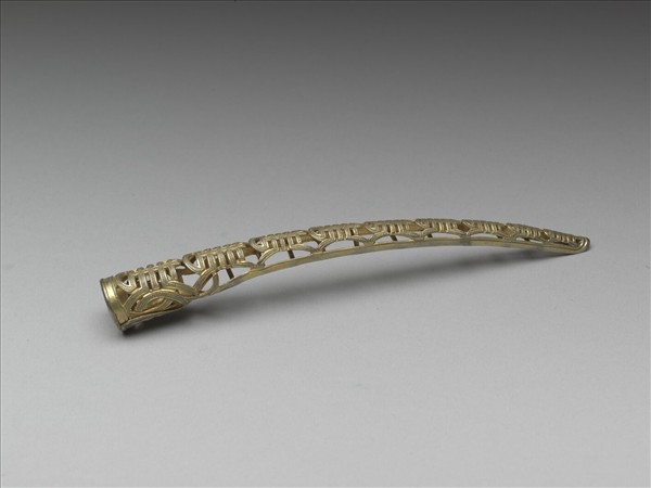 弓形,從基部到指尖漸漸變細,面作壽字紋飾連珠紋為地,紋飾從指尖逐漸變小,兩側以連環紋做裝飾,背部作空格式。此器與故雜3813為一對。