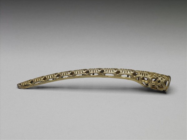 弓形,從基部到指尖漸漸變細,基部斜格網紋上飾連珠紋,面作壽字紋飾連珠紋為地,紋飾從指尖逐漸變小,背部作空格式。此器與故雜3815為一對。