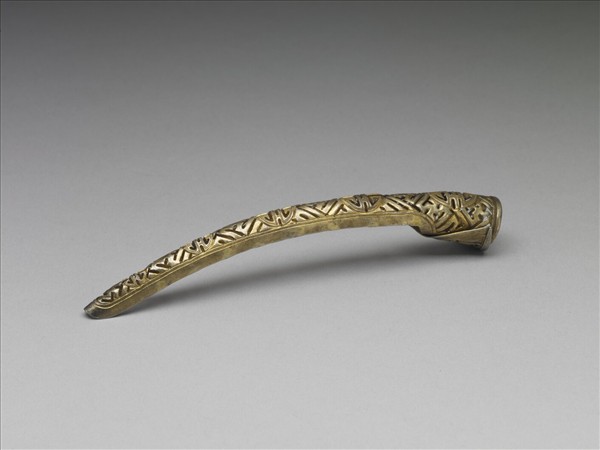 弓形,從基部到指尖漸漸變細,面作壽字紋飾連珠紋,中間以卍字紋為地,紋飾從指尖逐漸變小,背部作空格式。此器與故雜3819為一對。