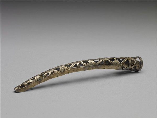 弓形,從基部到指尖漸漸變細,面作梅花樣式,中間以十字形紋為地,紋飾從指尖逐漸變小,背部作空格式。此器與故雜3821為一對。