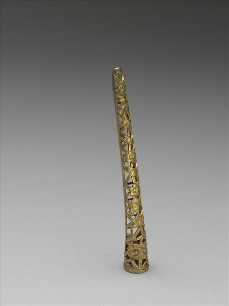 弓形,從基部到指尖漸漸變細,基座有兩朵梅花連接做一朵,其餘面作梅花紋,紋飾從指尖逐漸變小,背部作空格式。此器與故雜3839為一對。