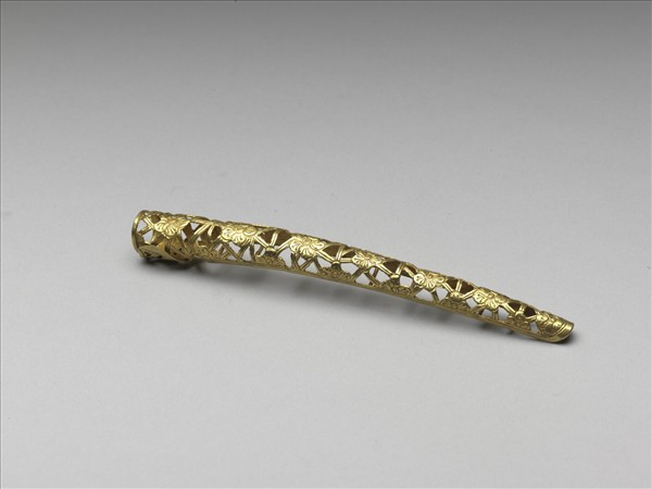 弓形,從基部到指尖漸漸變細,面作梅花紋,紋飾從指尖逐漸變小,背部作空格式。此器與故雜3842為一對。
