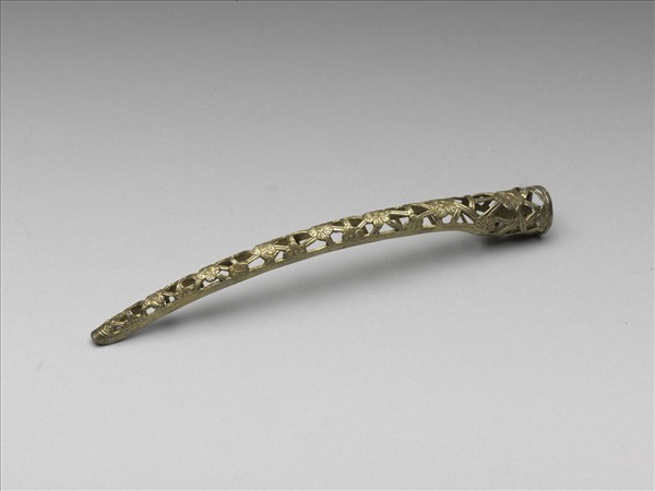 弓形,從基部到指尖漸漸變細,面作梅花紋,紋飾從指尖逐漸變小,背部作空格式。此器與故雜3846為一對。