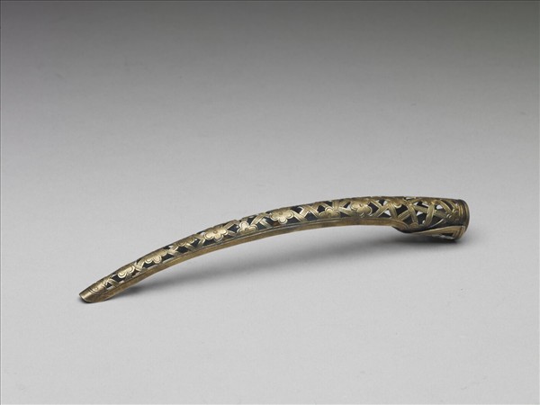 弓形,從基部到指尖漸漸變細,面作梅花紋,交叉的線條上刻有連珠紋,紋飾從指尖逐漸變小,背部作空格式。此器與故雜3849為一對。