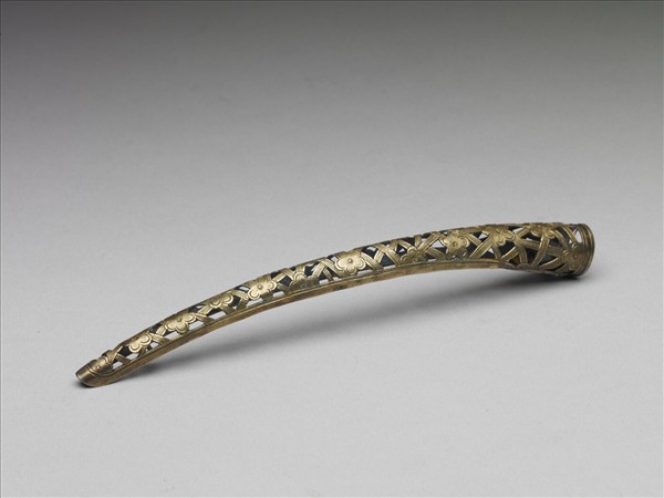 弓形,從基部到指尖漸漸變細,面作梅花紋,交叉的線條上刻有連珠紋,紋飾從指尖逐漸變小,背部作空格式。此器與故雜3848為一對。