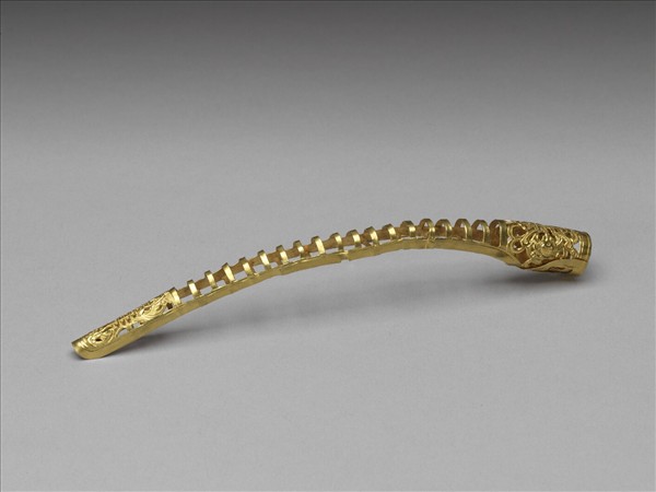 弓形,從基部到指尖漸漸變細,基座有壽字紋,左右各有蝙蝠,呈兩蝠捧壽。壽字紋面上飾連珠紋,面作鏤空一字紋,指尖處有壽字紋,上下各有蝙蝠,亦呈兩蝠捧壽,背部作空格式。此器與故雜3853為一對。