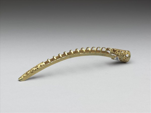 弓形,從基部到指尖漸漸變細,基座有壽字紋,左右各有蝙蝠,呈兩蝠捧壽。壽字紋面上飾連珠紋,面作鏤空一字紋,指尖處有壽字紋,上下各有蝙蝠,亦呈兩蝠捧壽,背部作空格式。此器與故雜3854為一對。
