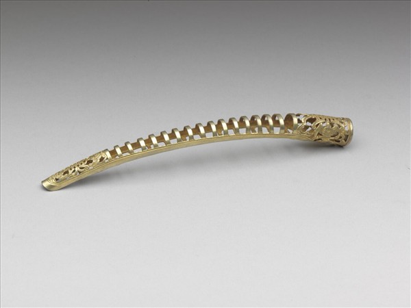 弓形,從基部到指尖漸漸變細,基座有壽字紋,左右各有蝙蝠,呈兩蝠捧壽。壽字紋面上飾連珠紋,面作鏤空一字紋,指尖處有壽字紋,上下各有蝙蝠,亦呈兩蝠捧壽,背部作空格式。此器與故雜3861為一對。