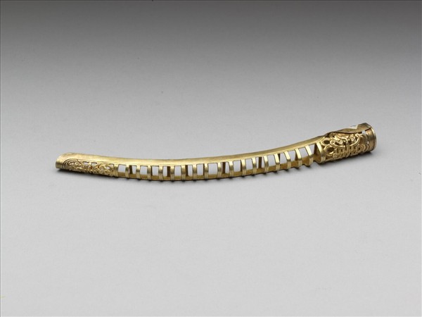 弓形,從基部到指尖漸漸變細,基座有壽字紋,左右各有蝙蝠,呈兩蝠捧壽。壽字紋面上飾連珠紋,面作鏤空一字紋,指尖處有壽字紋,上下各有蝙蝠,亦呈兩蝠捧壽,背部作空格式。此器與故雜3865為一對。