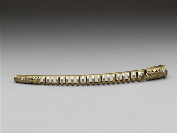 弓形,從基部到指尖漸漸變細,基座有壽字紋,左右各有蝙蝠,呈兩蝠捧壽。壽字紋面上飾連珠紋,面作鏤空一字紋,指尖處有壽字紋,上下各有蝙蝠,亦呈兩蝠捧壽,背部作空格式。此器與故雜3867為一對。