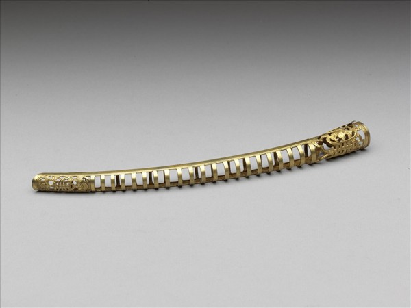 弓形,從基部到指尖漸漸變細,基座有壽字紋,左右各有蝙蝠,呈兩蝠捧壽。壽字紋面上飾連珠紋,面作鏤空一字紋,指尖處有壽字紋,上下各有蝙蝠,亦呈兩蝠捧壽,背部作空格式。此器與故雜3868為一對。