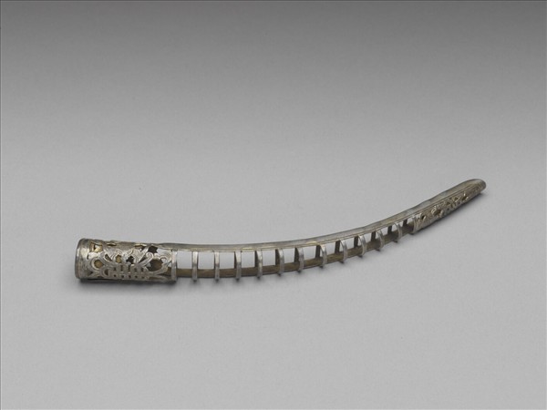弓形,從基部到指尖漸漸變細,基座有壽字紋,左右各有蝙蝠,呈兩蝠捧壽。壽字紋面上飾連珠紋,面作鏤空一字紋,指尖處有壽字紋,上下各有蝙蝠,亦呈兩蝠捧壽,背部作空格式。此器與故雜3879為一對。