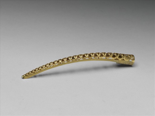 弓形,從基部到指尖漸漸變細,面作鏤空連環紋,紋飾從指尖逐漸變小,紋面上飾連珠紋,背部作空格式。此器與故雜3882為一對。