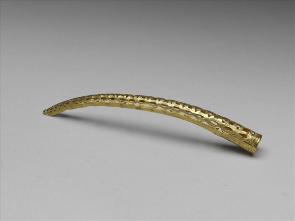 弓形,從基部到指尖漸漸變細,面作鏤空錢紋,紋飾從指尖逐漸變小,紋面上飾連珠紋,背部作空格式。此器與故雜3885為一對。