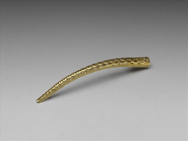 弓形,從基部到指尖漸漸變細,面作鏤空錢紋,紋飾從指尖逐漸變小,紋面上飾連珠紋,背部作空格式。此器與故雜3884為一對。