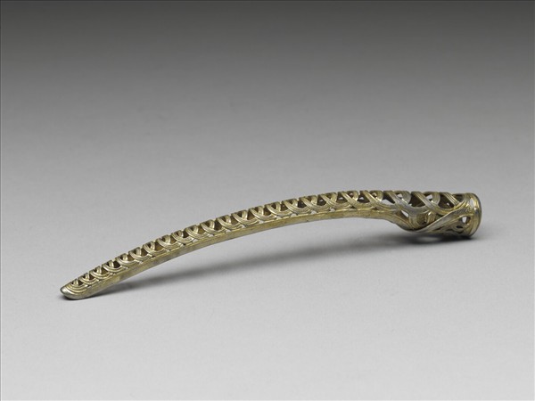 弓形,從基部到指尖漸漸變細,面作鏤空連環紋,紋飾從指尖逐漸變小,紋面上飾連珠紋,背部作空格式。此器與故雜3893為一對。