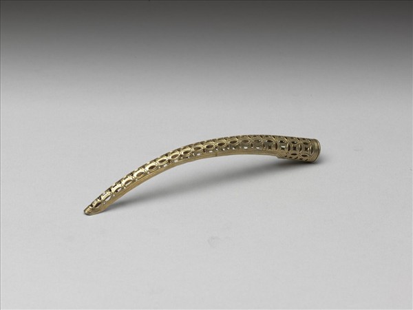 弓形,從基部到指尖漸漸變細,面作鏤空錢紋,紋飾從指尖逐漸變小,背部作空格式。此器與故雜3894為一對。